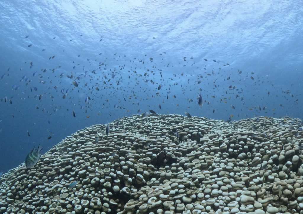 周りには、スズメダイがわんさか集まって