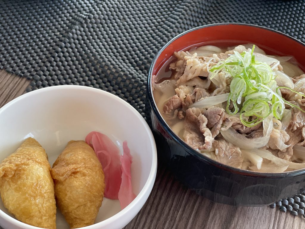 今日は、牛肉と玉ねぎのかけうどん&いなり寿司でした!