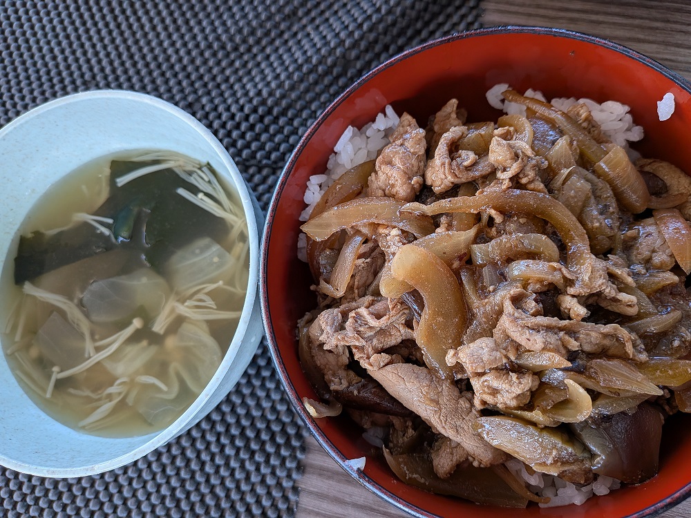 本日のランチは、「ナスと豚肉のトウジ炒めとスープでした」