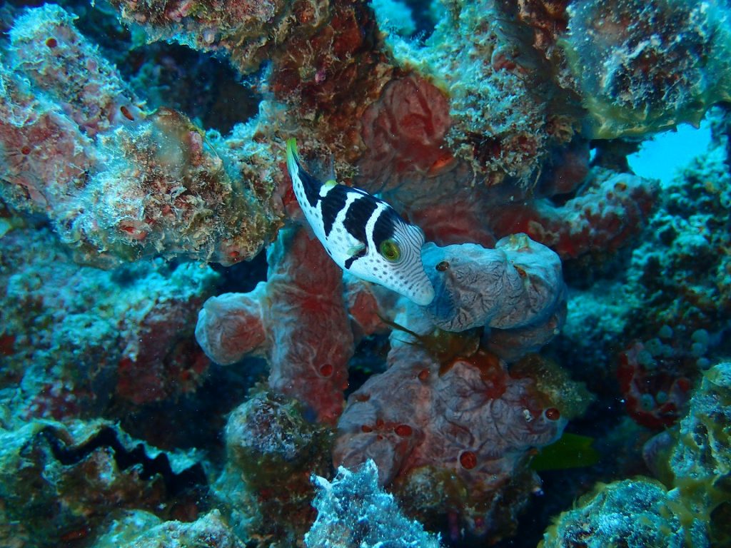 シマキンチャクフグとノコギリハギが一緒にいるのはたまに見かけるのですが、