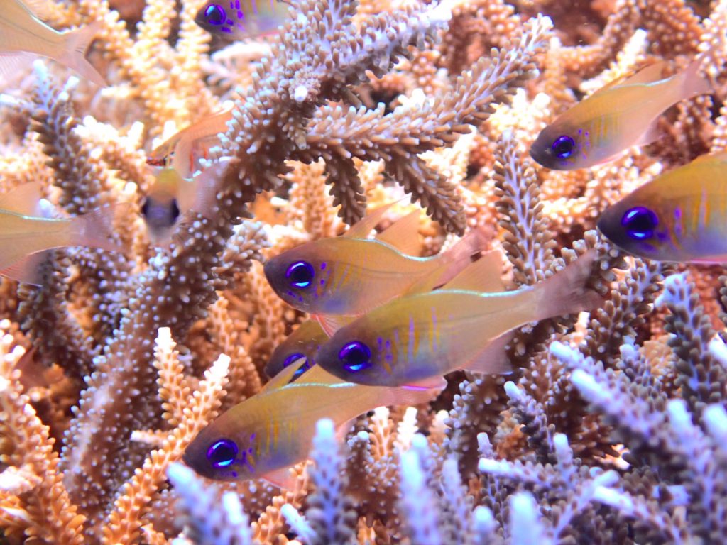 サンゴの隙間には、蛍光ブルーの目が