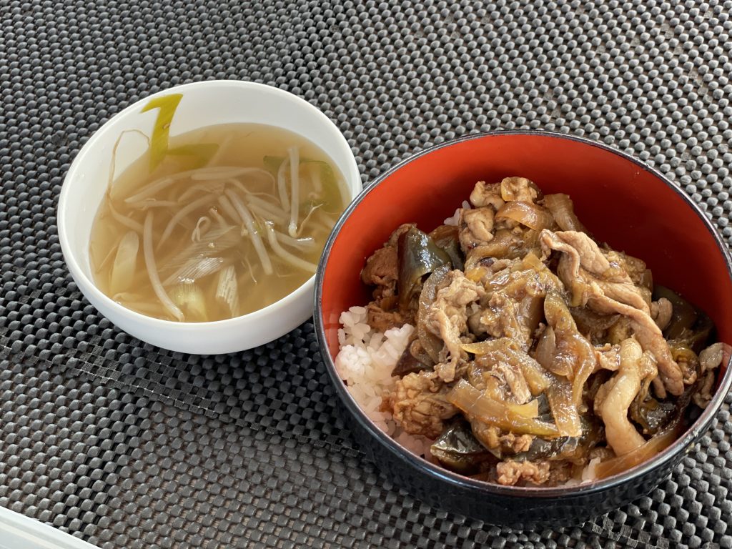 今日は、ナスと豚肉のトウジ炒め丼&スープでした!