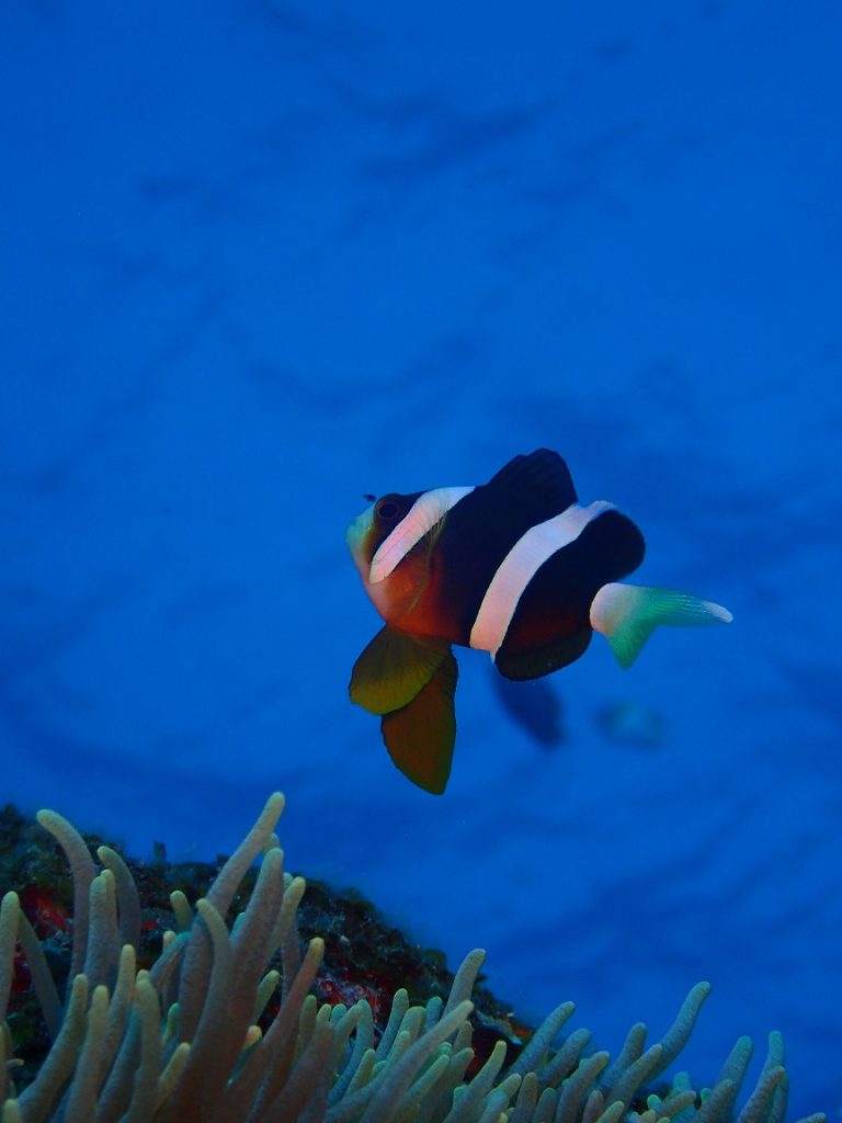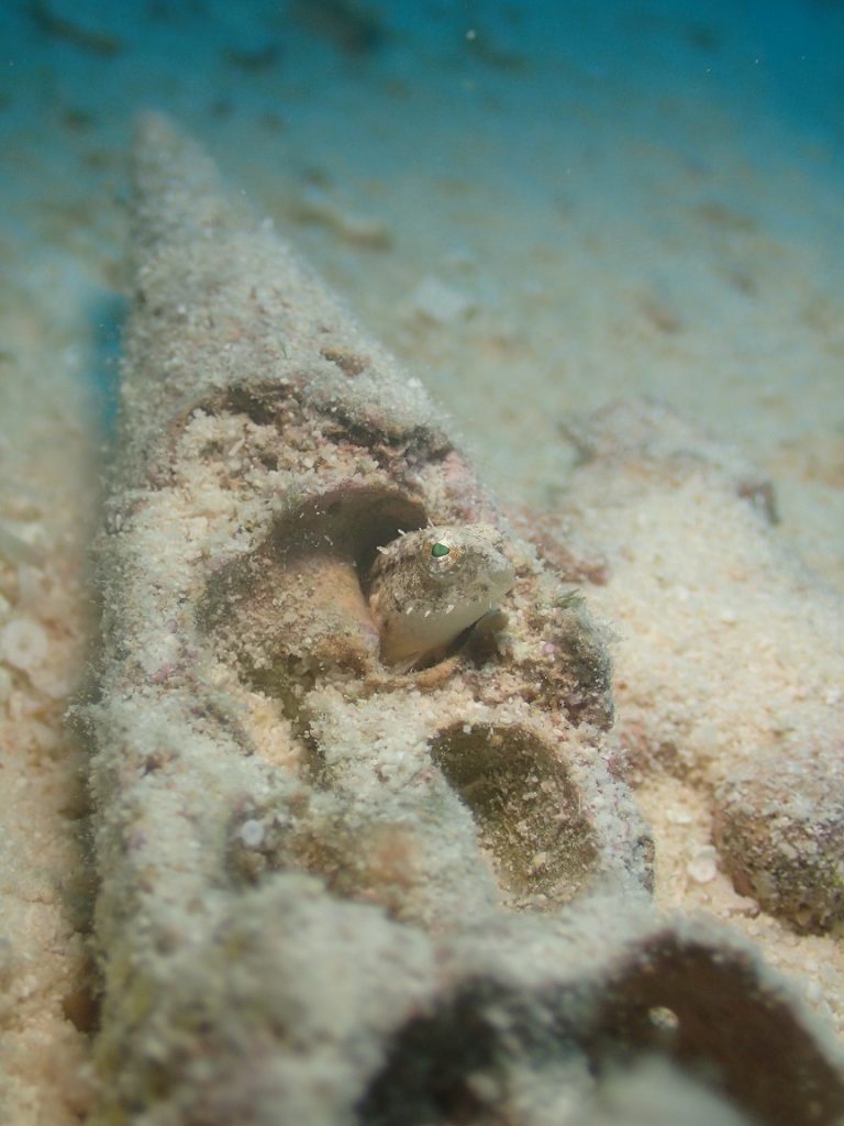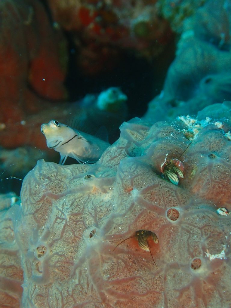 アイドルのイシガキカエルウオを発見したのですが、ちょうどそばにカンザシヤドカリのお家があったんです。撮る角度をちょっと考えていくと・・・うまくコラボができました!