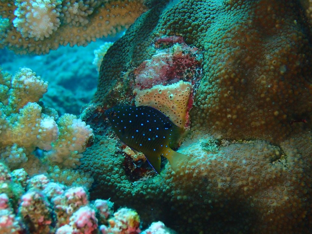 ルリホシスズメダイは大きくなってくると瑠璃色の斑点が分かりづらくなるのですが、