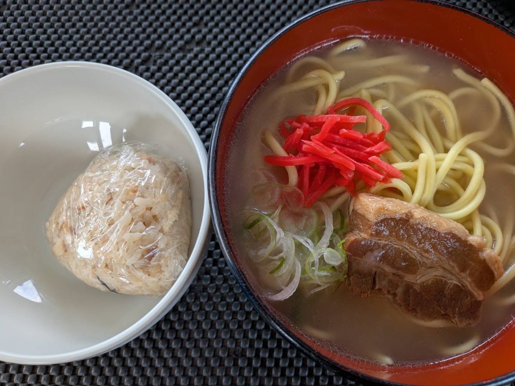 今日は、豚三枚肉そば&じゅーしーおにぎりでした!