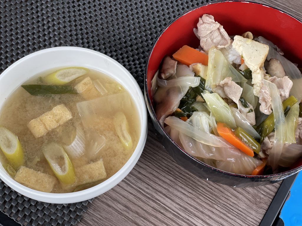 今日は、豚肉と春野菜のあんかけ丼&味噌汁でした!