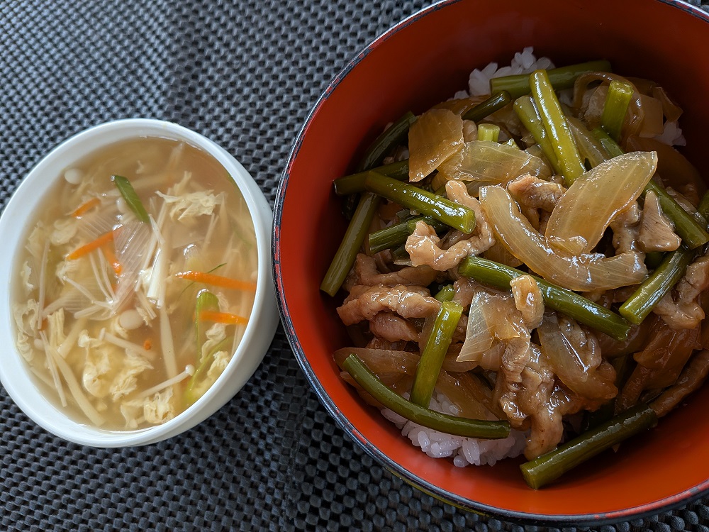 今日のランチは、「豚肉とニンニクの芽の香味炒めとスープ」でした。