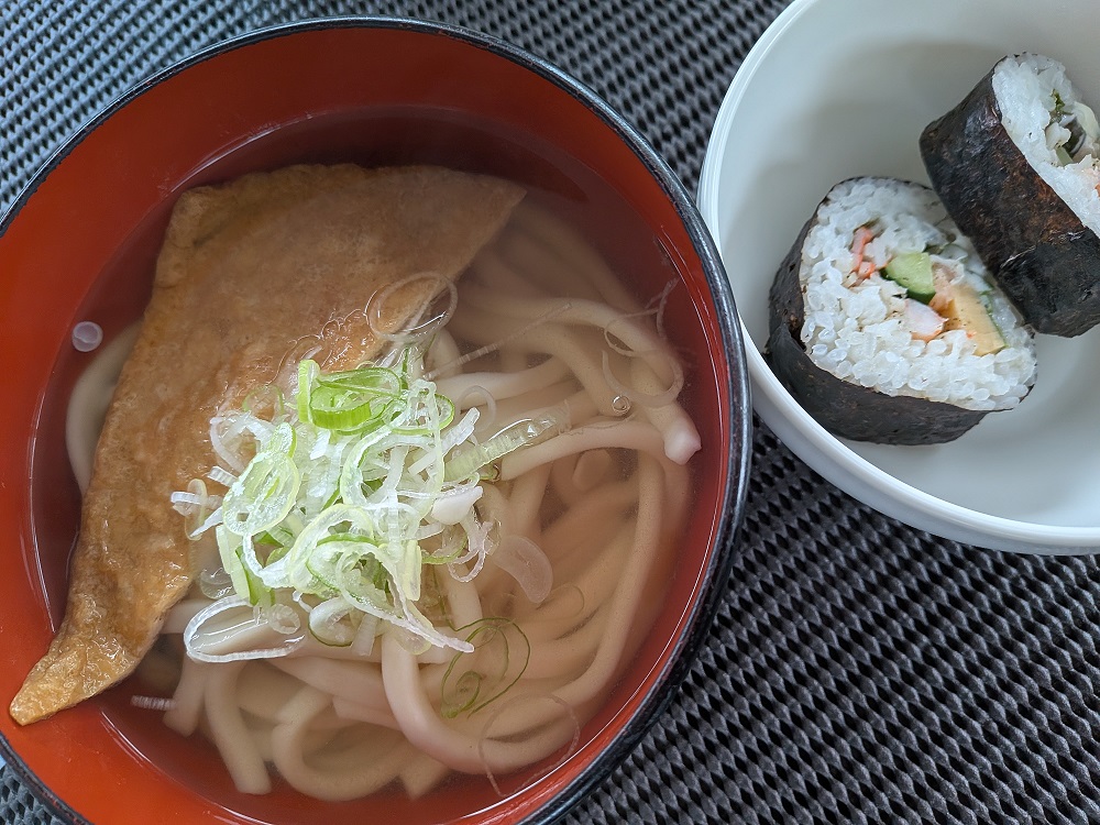 最後に今日のランチは「きつねうどんと海鮮サラダ巻き寿司」でした。